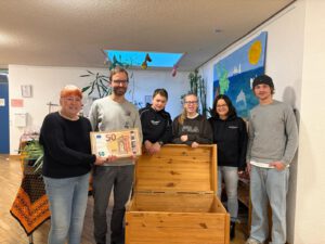 In einer Dienstbesprechung wurde eine Holztruhe versteigert. Die Truhe kam vom Sperrmüll. Die klasse 8b hatte sie vorher repariert. Einige Kolleg*innen haben Gebote abgegeben. Sven hat für 50€ die Truhe